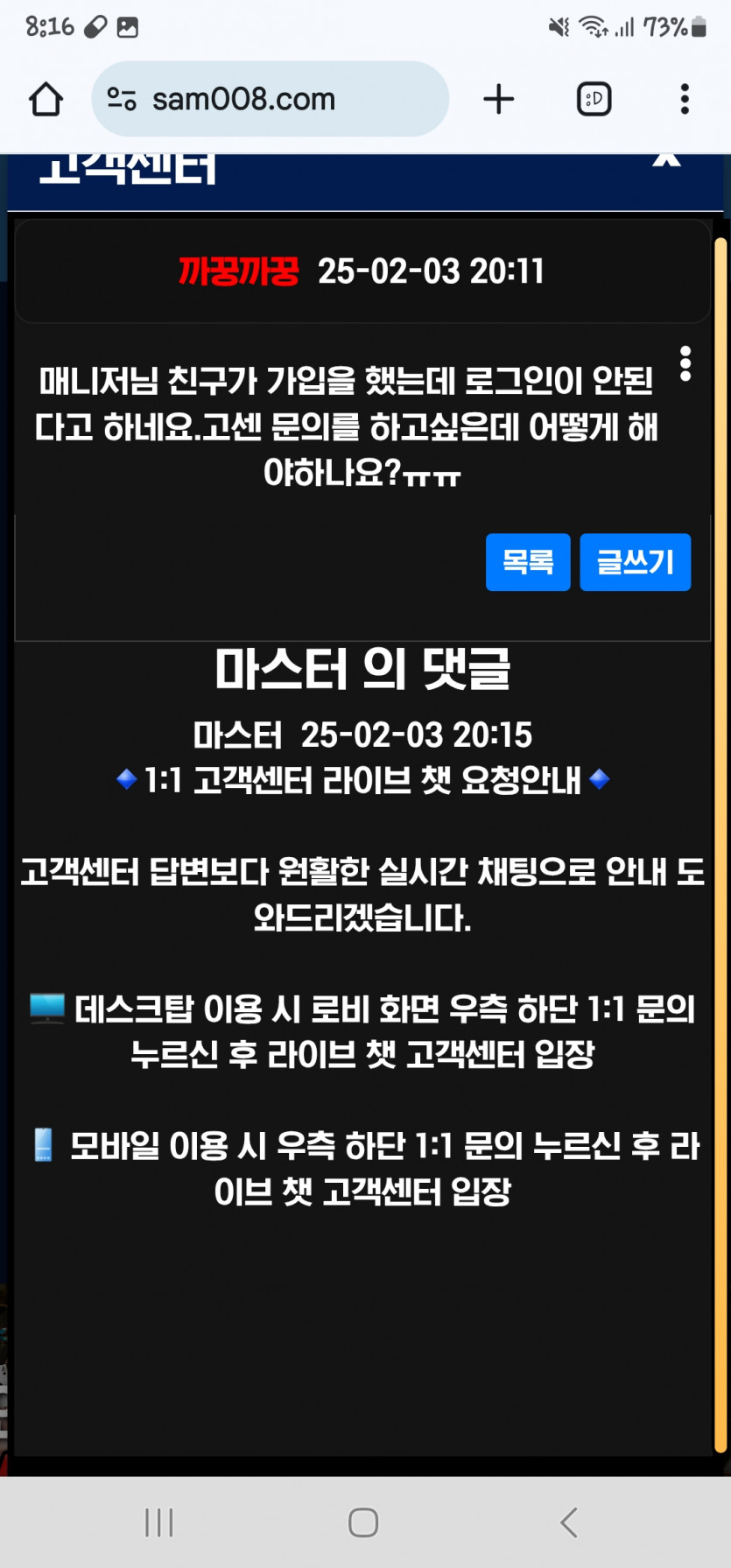 이겨부리자님의 댓글의 댓글 이겨부리자쪽지보내기 메일보내기 자기소개 아이디로 검색 전체게시물쪽지보내기 메일보내기 자기소개 아이디로 검색 전체게시물 작성일 2025.02.03 21:39 네 삼성이랑 저랑 안맞나보네요 네 삼성이랑 저랑 안맞나보네요